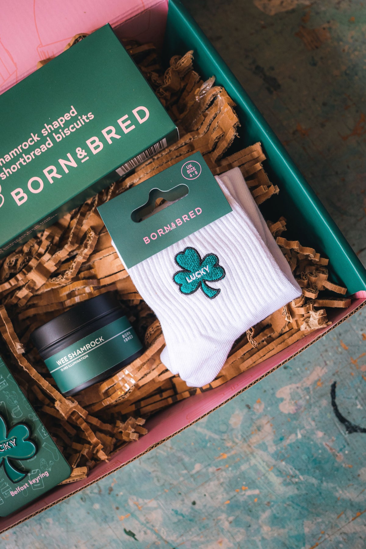 Bring a sprinkle of Irish charm to someone special with this delightful gift collection. Inside you'll find a lucky shamrock keyring, a cosy mini shamrock candle, festive shamrock ankle socks, and shamrock-shaped shortbread treats—all nestled in our signature Born & Bred gift box. No wrapping required, just pure luck and personality ready to gift.