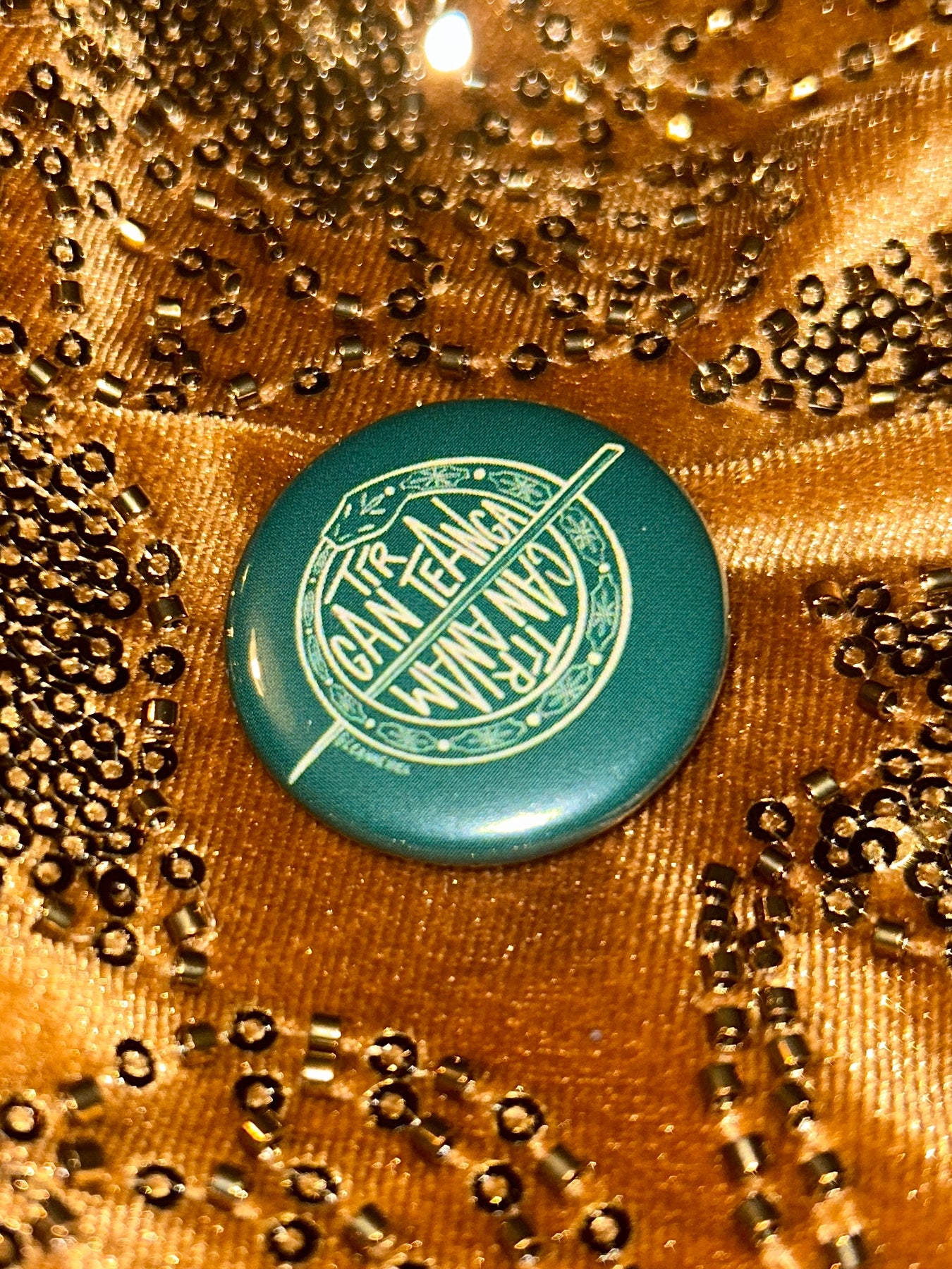 Stevie Nicks button badge with illustration on pink card held by a hand