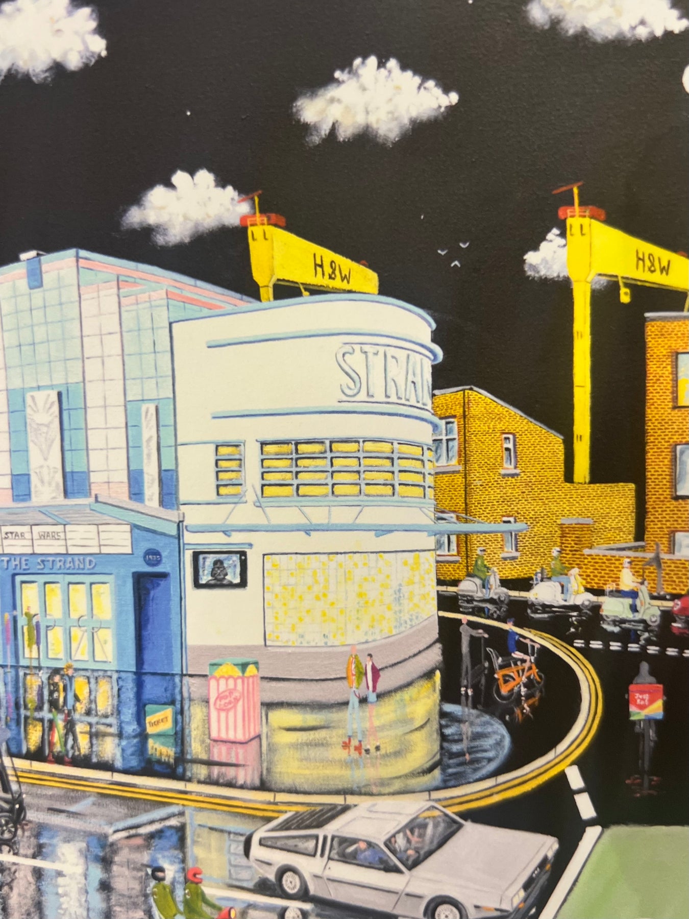 Foss, who was born in Belfast in 1968, is a self-taught artist and works in various mediums. His paintings are based on growing up in Northern Ireland, and focus on the little two up two down terraces packed with life and the streets around them which built our character.