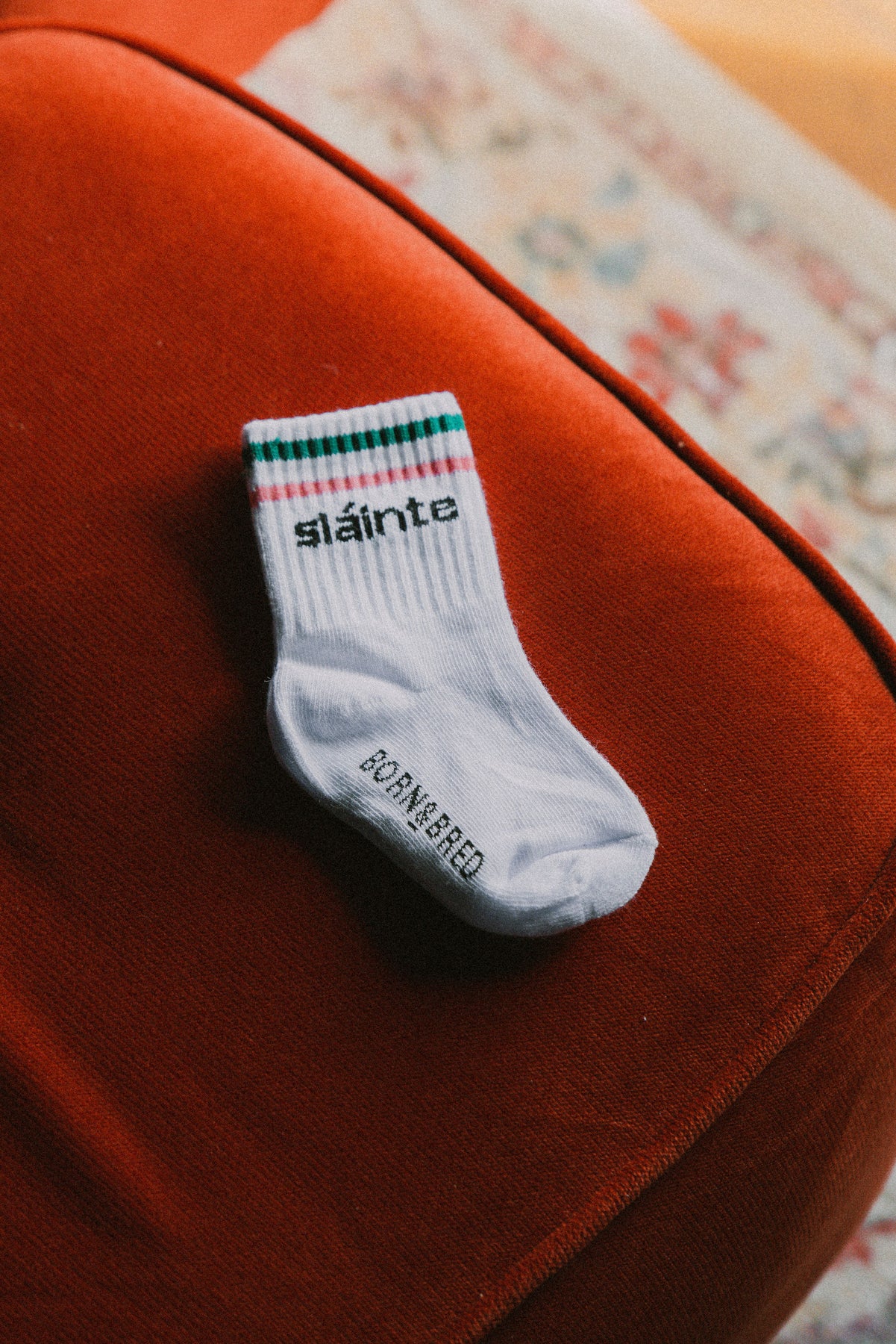 These adorable Slainte baby socks are bound to be a favourite for your little one! Featuring a white base with green and pink stripes at the top, they have a fun message on each side to make slipping them onto tiny feet quick and easy.